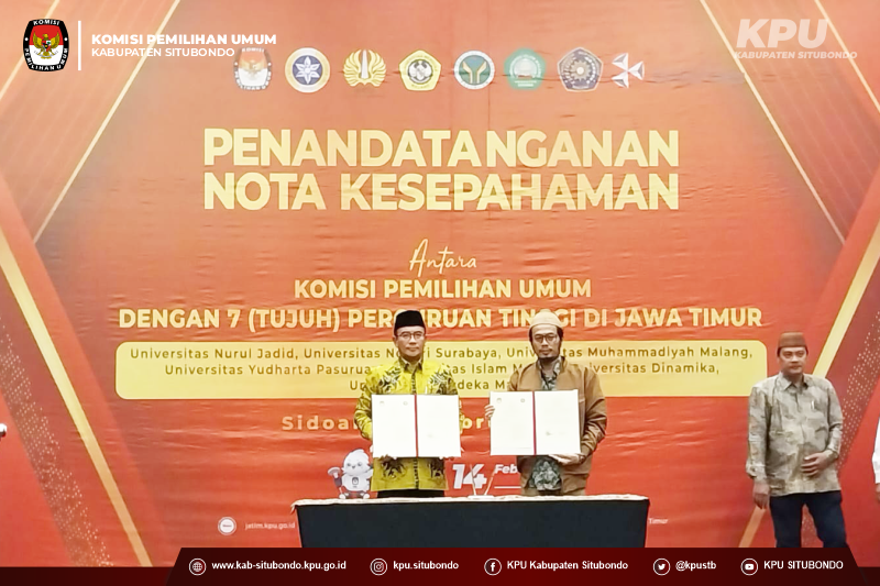 kab-situbondo.kpu.go.id - Komisi Pemilihan Umum (KPU) melakukan penandatanganan Nota Kesepahaman atau Memorandum of Understanding (MoU) terkait Pelaksanaan Tri Dharma Perguruan Tinggi di Bidang Kepemiluan dan Demokrasi, dengan lima Perguruan Tinggi di Jawa Timur, di Sidoarjo, Selasa (7/2).