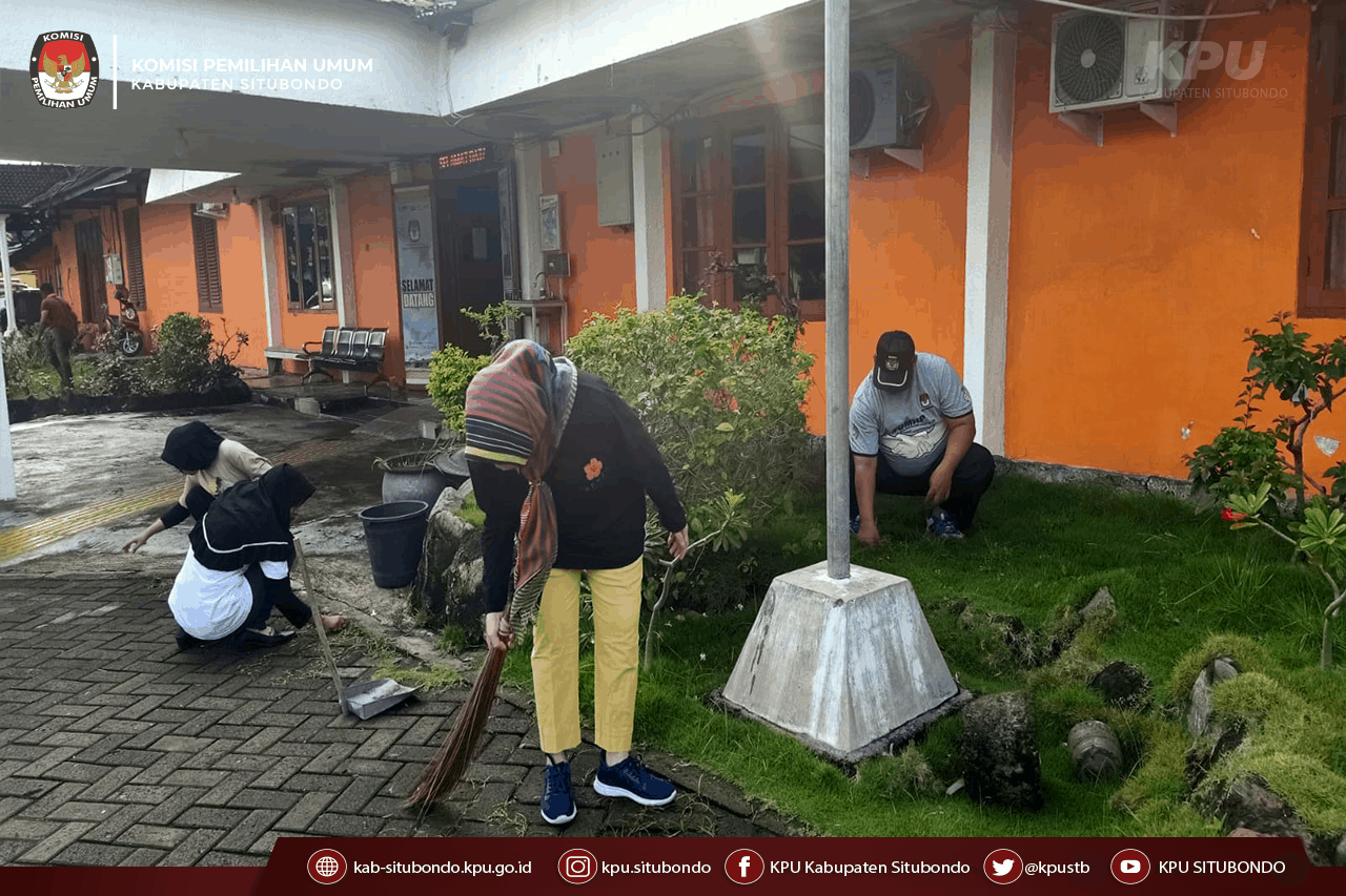 Situbondo , kab-situbondo.kpu.go.id, Lingkungan yang bersih mencerminkan pribadi yang bersih. Hal ini disampaikan oleh Sekretaris KPU Kabupaten Situbondo, Sanayo saat menkomandoi staf dalam Jumat Bakti yakni kerja bakti bersih-bersih kantor, seperti membersihkan halaman, membersihkan ruang kerja, merapikan arsip, membersihkan dahan-dahan pohon, dll.