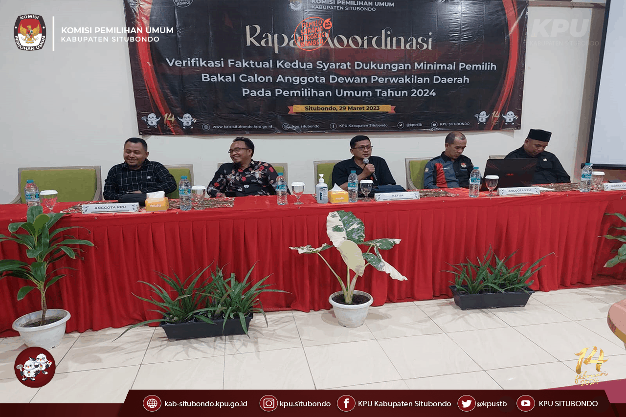 Situbondo, kab-situbondo.kpu.go.id - KPU Kabupaten Situbondo pada hari Rabu, tanggal 29 Maret, mengadakan Rapat Koordinasi Verifikasi Faktual Kedua untuk Syarat Dukungan Minimal Pemilih Bakal Calon Anggota Dewan Perwakilan Daerah pada Pemilihan Umum tahun 2024. Kegiatan ini dilaksanakan di ruang pertemuan Jasmine Rosali Hotel, Situbondo.