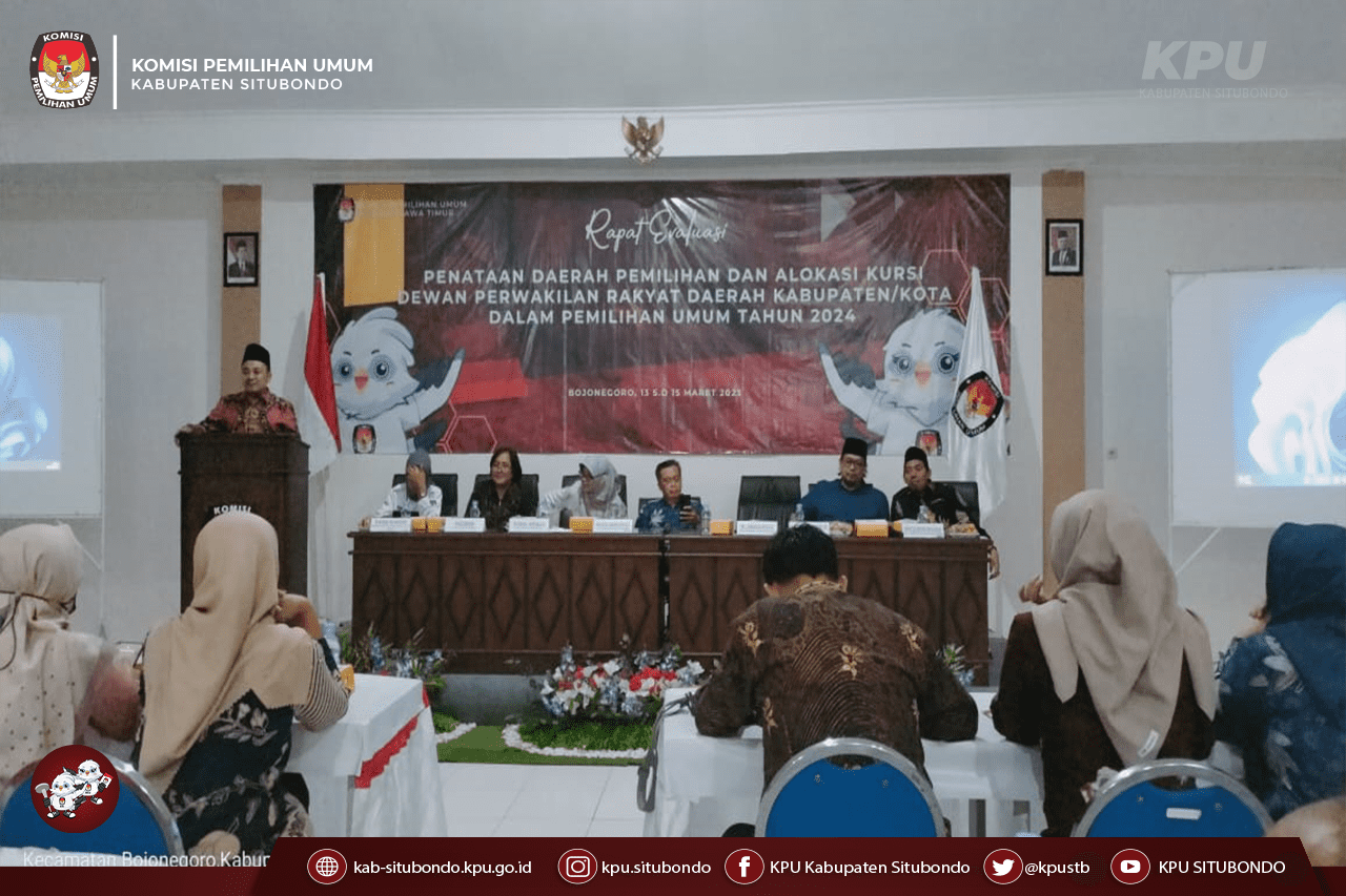 BOJONEGORO, kab-situbondo.kpu.go.id – Komisi Pemilihan Umum Kabupaten Situbondo hadiri Rapat Evaluasi Penataan Daerah Pemilihan (Dapil) dan Alokasi Kursi Anggota Dewan Perwakilan Rakyat Daerah (DPRD) Kabupaten/Kota dalam Pemilu Tahun 2024, yang digelar pada Senin – Rabu, 13 – 15 Maret 2023.