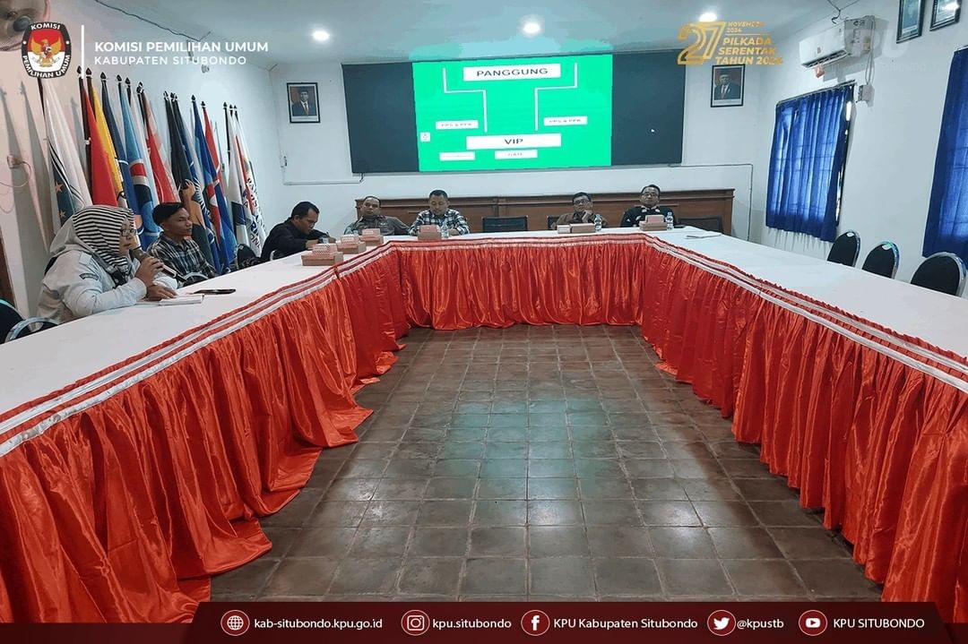 Komisi Pemilihan Umum (KPU) Kabupaten Situbondo mengadakan rapat koordinasi di ruang Media Center untuk membahas persiapan Launching Pilkada Kabupaten Situbondo tahun 2024. Rapat ini dihadiri oleh jajaran anggota KPU, Kasubbag Teknis dan Hupmas, serta tim dari Event Organizer (EO) yang akan bekerja sama dalam penyelenggaraan acara tersebut.