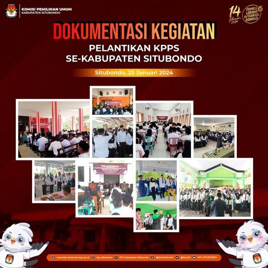 Situbondo, 25 Januari 2024 - Komisi Pemilihan Umum (KPU) Kabupaten Situbondo menyampaikan selamat dan sukses atas pelantikan 14.105 Kelompok Penyelenggara Pemungutan Suara (KPPS) se-Kabupaten Situbondo yang diselenggarakan pada tanggal 25 Januari 2024 lalu.