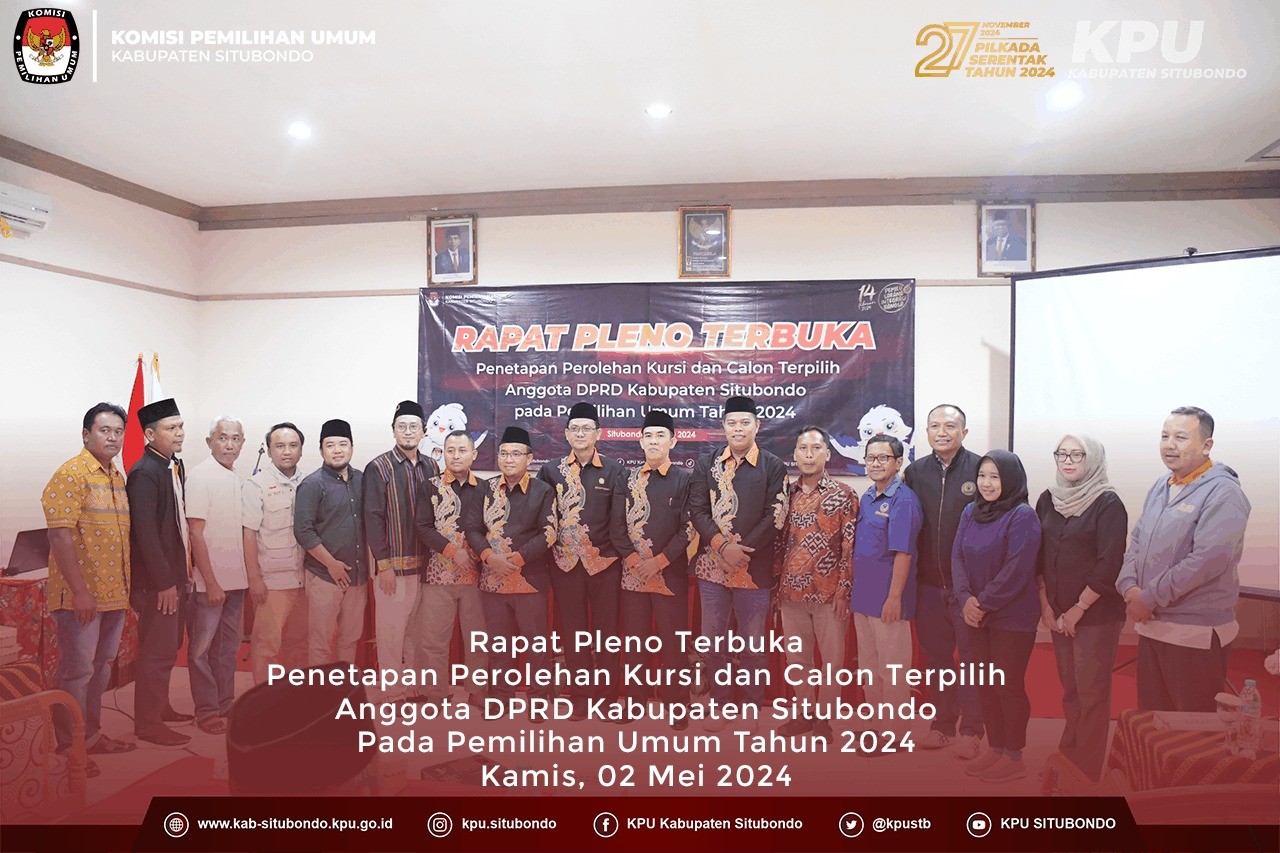 Suasana Ballroom Jasmine Hotel Rosali Situbondo dipenuhi dengan antusiasme dan tegangnya momen penentuan pada Kamis, 2 Mei 2024. Komisi Pemilihan Umum (KPU) Kabupaten Situbondo menggelar Rapat Pleno Terbuka untuk menetapkan perolehan kursi dan calon terpilih anggota Dewan Perwakilan Rakyat Daerah (DPRD) Kabupaten Situbondo hasil Pemilihan Umum Tahun 2024.