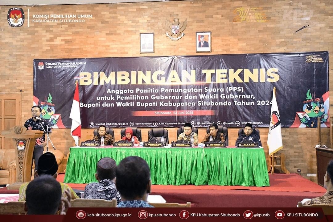 Komisi Pemilihan Umum (KPU) Kabupaten Situbondo menyelenggarakan Bimbingan Teknis (Bimtek) untuk Anggota Panitia Pemungutan Suara (PPS) dalam rangka persiapan Pemilihan Gubernur dan Wakil Gubernur serta Bupati dan Wakil Bupati Kabupaten Situbondo. Acara ini diadakan di Hotel Sansui, Kendit, Situbondo, pada hari Rabu, 1 Agustus 2024.