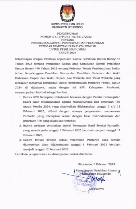 PERUBAHAN JADWAL PENETAPAN DAN PELANTIKAN PETUGAS PEMUTAKHIRAN DATA PEMILIH UNTUK PEMILIHAN UMUM TAHUN 2024