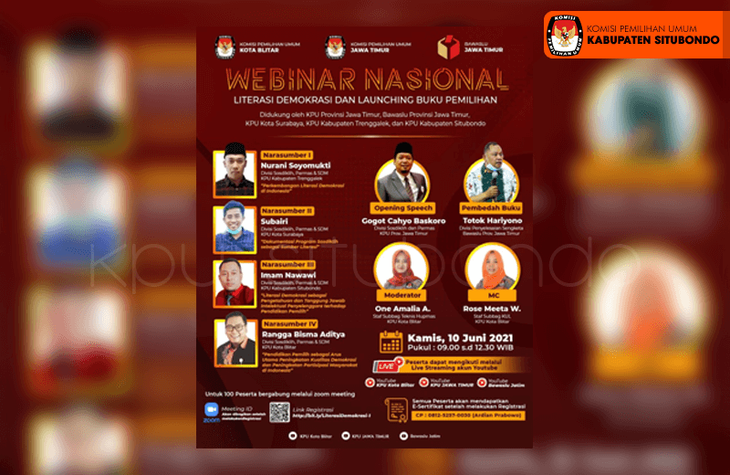 Situbondo,kab-situbondo.kpu.go.id -Webinar skala nasional ini bertujuan dalam rangka peningkatan kualitas demokrasi dan partisipasi masyarakat pada pemilu, KPU Kota Blitar melaksanakan WEBINAR Literasi Demokrasi & Launching Buku Pemilihan. Acara tersebut diikuti oleh 34 KPU Kabupaten/Kota di Jawa Timur Webinar Nasional ""Literasi Demokrasi & Launching Buku Pemilihan"" ini menghadirkan narasumber dan penyelenggara Pemilihan Serentak 2020, yang pasca tahapan telah mampu mendokumentasikannya ke dalam sebuah buku. Harapannya dengan adanya kegiatan dan buku ini, mampu meningkatkan literasi masyarakat mengenai demokrasi dan kepemiluan, serta menjadi bahan rekomendasi kebijakan selanjutnya. Acara ini dilaksanakan atas kerjasama KPU Kota Blitar bersama KPU Provinsi Jawa Timur, Bawaslu Provinsi Jawa Timur, KPU Kota Surabaya, KPU Kabupaten Trenggalek, dan KPU Kabupaten Situbondo. Acara dibuka oleh sambutan dari Anggota KPU Provinsi Jawa Timur Divisi Sosdiklih dan Parmas Gogot Cahyo Baskoro, kemudian dilanjutkan dengan paparan dari ke 4 narasumber undangan. Anggota KPU Kabupaten Situbondo Imam Nawawi berkesempatan menjadi narasumber dalam webinar tersebut bersama 3 (tiga) Anggota KPU dari Kabupaten/Kota lain, Yaitu Nurani Soyomukti (KPU Kabupaten Trenggalek), Subairi (KPU Kota Surabaya) dan juga Rangga Bisma Aditya (KPU Kota Blitar). Penulis : Hendrik Kristanto Editor : Tim Editor"