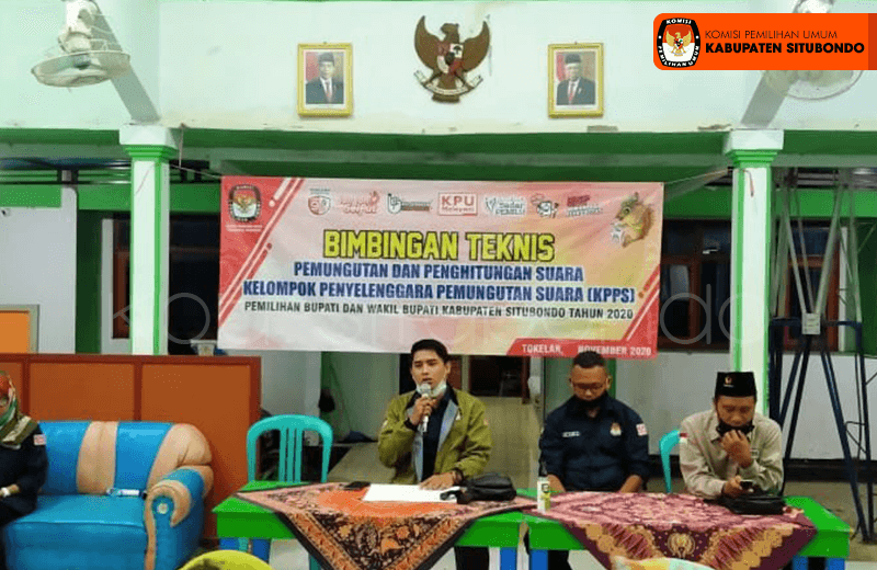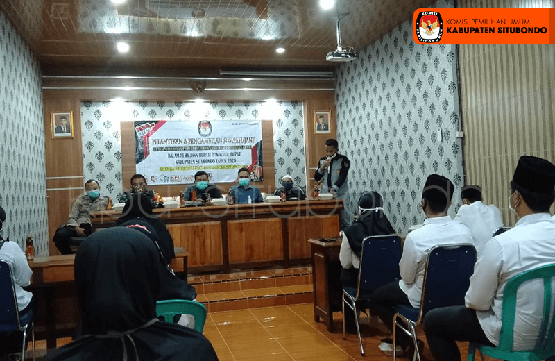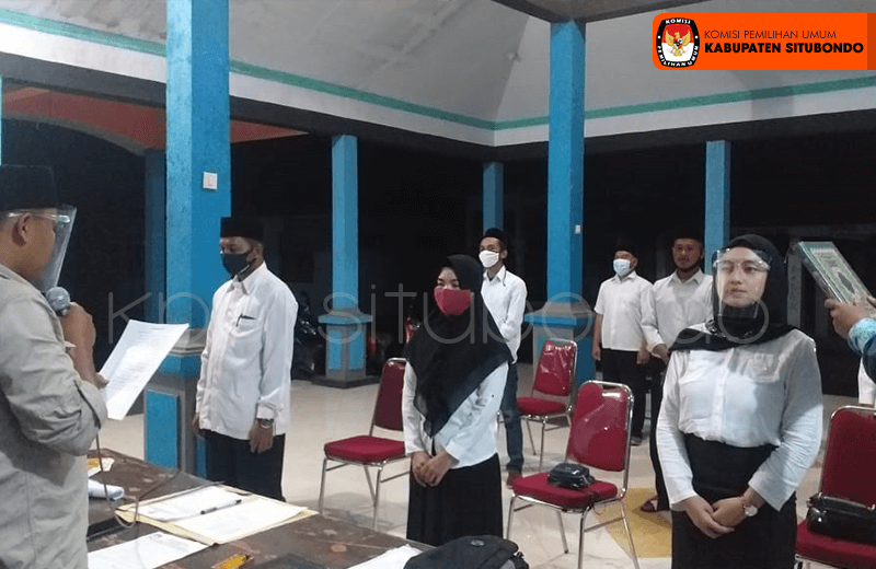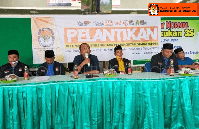 kab-situbondo.kpu.go.id – Panji_Pelantikan Ketua Kelompok Penyelenggara Pemungutan Suara (KPPS) Pemilihan Bupati dan Wakil Bupati Kabupaten Sitibondo tahun 2020 oleh Panitia Pemungutan Suara (PPS) Desa Tokelan. Kegiatan ini dilaksanakan di Balai Desa tokelan, Senin, 23/11/2020. Kegiatan ini dibuka dengan Sholawat Nariyah dilanjutkan dengan pembacaan SK KPPS oleh Sekretaris PPS Desa Tokelan, Sahrawi Musa. Pengambilan sumpah dipandu oleh Ketua PPS Tokelan, Arif Slamet Mulyanto dilanjutkan dengan sambutan. Dalam sambutannya, beliau menegaskan kepada para ketua Kelompok Penyelenggara Pemungutan Suara (KPPS) untuk menjaga integritas sebagai penyelenggara, memegang teguh sumpah jabatan yang sudah diucapkan demi suksesnya penyelenggaraan pemungutan suara, khususnya di Tokelan. “Saya percaya kepada Bpak ibu sekalian mampu dan bisa menjaga integritas serta komitmen sebagaimana yang telah bapak ibu sekalian ucapkan pada sumpah janji yang bapak ibu sekalian ucapkan, serta mampu mensukseskan pemilihan Bupati dan wakil Bupati Kabaupaten Situbondo tahun 2020. Selain Melantik Kelompok Penyelenggara Pemungutan Suara (KPPS) Beliau juga berharap kepada ketua KPPS yang telah dilantik agar nantinya mampu memberikan bimbingan serta arahan kepada Anggota KPPS yang lain demi sukses dan lancaranya pemungutan serta penghitungan suara pada 9 Desember 2020 “selain mensukseskan Pemilihan Bupati Dan Wakil Bupati Situbondo tahun 2020, saya berharap Bapak Ibu menjadi pembimbing bagi anggotanya untuk dipersiapkan segala tugas dan fungsinya agar nantinya pada hari pemungutan tidak ada kendala serta persoalan yang muncul, agar pemungutan dan penghitungan berjalan dengan lancar. Penulis : PPK PANJI Editor : Tim Editor