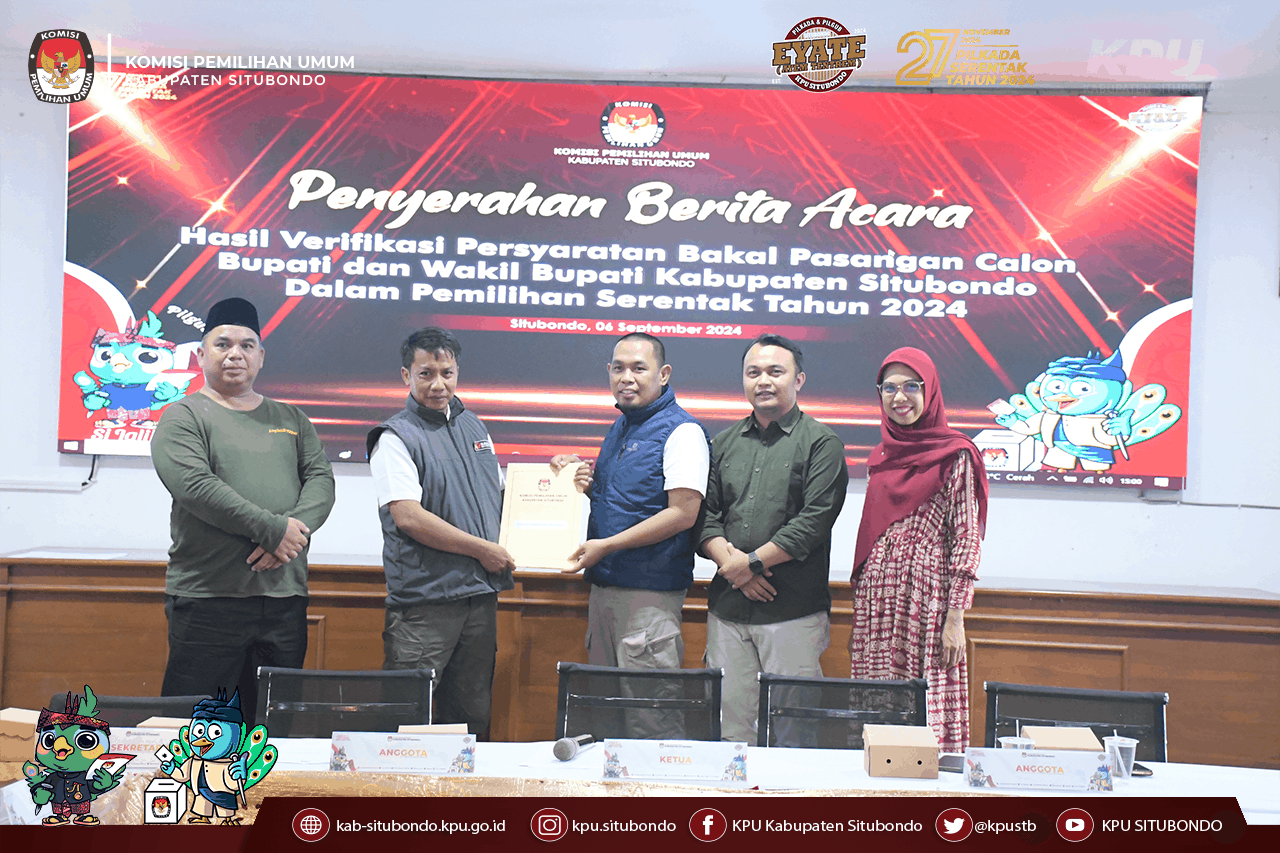 *Situbondo, 06 September 2024* – Komisi Pemilihan Umum (KPU) Kabupaten Situbondo hari ini menggelar kegiatan penting dalam rangka Pemilihan Serentak Tahun 2024. Bertempat di Ruang Media Center, KPU Kabupaten Situbondo resmi menyerahkan Berita Acara Hasil Verifikasi Bakal Pasangan Calon Bupati dan Wakil Bupati Kabupaten Situbondo. Acara ini dihadiri oleh berbagai pihak terkait, termasuk perwakilan dari bakal pasangan calon, serta Bawaslu Kabupaten Situbondo. Penyerahan Berita Acara ini merupakan langkah krusial dalam tahapan pemilihan, sebagai bagian dari proses memastikan bahwa semua bakal pasangan calon telah memenuhi syarat dan ketentuan yang berlaku. Divisi Teknis Penyelenggaraan KPU Kabupaten Situbondo, Bustamil Arifin, dalam sambutannya menyampaikan bahwa proses verifikasi ini dilakukan dengan penuh ketelitian untuk memastikan bahwa seluruh bakal pasangan calon memiliki kualifikasi yang sesuai. "Hari ini, kami menyerahkan Berita Acara hasil verifikasi sebagai bagian dari transparansi dan akuntabilitas dalam penyelenggaraan pemilihan," ujarnya. Proses verifikasi ini meliputi pemeriksaan dokumen persyaratan, validasi data, serta uji kelayakan yang dilakukan oleh tim verifikasi KPU. Hasil dari verifikasi ini akan menjadi acuan untuk melanjutkan ke tahapan berikutnya, yaitu penetapan pasangan calon yang akan bertarung dalam pemilihan. Dengan adanya kegiatan ini, KPU berharap dapat memberikan kejelasan dan kepastian kepada masyarakat Situbondo mengenai calon-calon yang akan bersaing dalam Pilkada mendatang. KPU Kabupaten Situbondo juga mengingatkan bahwa tahapan selanjutnya akan segera dimulai, dan masyarakat diharapkan tetap aktif mengikuti perkembangan proses pemilihan. Kegiatan penyerahan Berita Acara ini diakhiri dengan sesi tanya jawab, di mana peserta dapat mengajukan pertanyaan terkait proses verifikasi dan tahapan pemilihan selanjutnya. KPU Kabupaten Situbondo berkomitmen untuk terus mengedepankan prinsip transparansi dan integritas dalam seluruh rangkaian proses pemilihan serentak tahun ini. (Putri & Luluk)