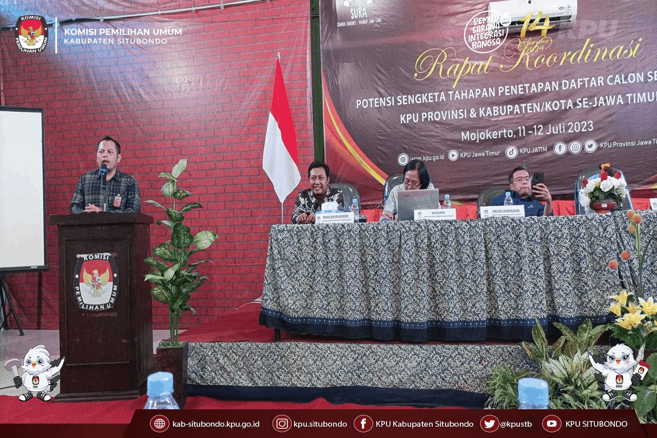 MOJOKERTO, kab-situbondo.kpu.go.id – Divisi Hukum dan Pengawasan KPU Kabupaten Situbondo beserta Kasubbag Hukum dan SDM hadir sebagai salah satu peserta Rapat Koordinasi Potensi sengketa tahapan Penetapan Daftar Calon Sementara (DCS) di kantor KPU Kabupaten Mojokerto, jalan Raak Adinegoro Mojokerto, Jawa Timur. Selasa – Rabu, 11 – 12 Juli 2023. Guna mempersiapkan hadapi potensi sengketa tahapan Penetapan Daftar Calon Sementara (DCS) di Jawa Timur, KPU Provinsi dan Kabupaten/Kota menggelar rapat koordinasi pada Selasa – Rabu, 11 – 12 Juli 2023, mulai pukul 14.00 WIB sampai selesai. Rakor dilaksanakan di kantor KPU Kabupaten Mojokerto, jalan Raak Adinegoro Mojokerto. Ketua KPU Jatim, Choirul Anam dalam sambutannya menyampaikan bahwa potensi sengketa penetapan DCS dapat bersumber dari internal maupun eksternal. Permasalahan internal terjadi karena kurang teliti dalam proses verifikasi, atau kurang pemahaman terhadap regulasi, lalu permasalahan soliditas di internal. Ia pun berharap untuk mengurangi potensi sengketa tahapan DCS, Divisi Hukum dan Pengawasan harus mampu memahami segala regulasi terkait dengan tahapan Pemilu tahun 2024. (HK)