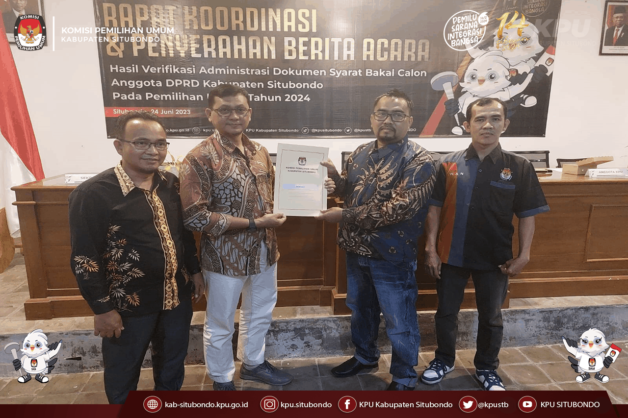 SITUBONDO, kab-situbondo.kpu.go.id – Komisi Pemilihan Umum (KPU) Kabupaten Situbondo pada Sabtu, (24/6/2023), melaksanakan penyampaian Berita Acara Hasil Verifikasi Administrasi Bakal Calon Anggota DPRD Kabupaten Situbondo pada Pemilu 2024 mendatang di ruang Media Center Kantor KPU Kabupaten Situbondo. Hal ini dilakukan, sesuai Peraturan KPU No 10 Tahun 2023 tentang Pencalonan Anggota Dewan Perwakilan Rakyat, Dewan Perwakilan Rakyat Daerah Provinsi, dan Dewan Perwakilan Rakyat Daerah Kabupaten/Kota. Rapat yang dihadiri Ketua dan LO partai politik peserta Pemilu Tahun 2024, Bawaslu Kabupaten Situbondo serta Kesbangpol Kabupaten Situbondo tersebut, dibuka langsung Ketua KPU Kabupaten Situbondo marwoto yang mana dalam sambutannya menyampaikan agar dalam masa perbaikan dokumen bakal calon yang dimulai pada 26 Juni hingga 9 Juli 2023, LO partai Politik aktif melakukan komunikasi dan koordinasi dengan KPU kabupaten Situbondo atau Helpdesk SILON KPU Kabupaten Situbondo tentang hal-hal yang belum dipahami terkait dokumen syarat bakal calon. Sehingga nantinya semua bakal calon dinyatakan memenuhi syarat. Sementara itu, Divisi Teknis Penyelenggara Pemilu KPU Kabupaten Situbondo Iwan Suryadi menyampaikan bahwa selama masa verifikasi administrasi dokumen syarat bakal calon oleh operator SILON, terdapat kesalahan-kesalahan teknis yang menyebabkan status bakal calon dinyatakan Belum Memenuhi Syarat (BMS), seperti kesalahan penulisan, dokumen yang belum dilegalisir, belum menggunakan foto terbaru dan lain sebagainya. "Selanjutnya terkait proses penyampaian perbaikan dokumen ke KPU Kabupaten Situbondo hampir sama dengan penyampaian dokumen pendaftaran, namun dalam hal ini pengurus partai politik tidak dapat melakukannya, hanya dapat dilakukan oleh LO partai politik saja." tutupnya. Acara diakhiri dengan penyerahan Berita Acara Hasil Verifikasi Administrasi Bakal Calon kepada masing-masing partai politik dan Bawaslu Kabupaten Situbondo. (HK)