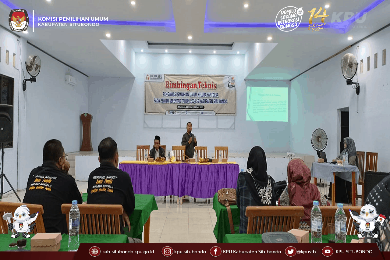 Bimbingan teknis Pengawas Pemilu Kelurahan/Desa dilaksanakan pada tanggal 31 Mei 2023 bertempat di Barokah Park, Kecamatan Asembagus, Kabupaten Situbondo, kegiatan ini mengikutsertakan seluruh jajaran Pengawas Pemilu Kelurahan/Desa se-Kabupaten Situbondo dengan jumlah keseluruhan 72 Orang. Bimbingan teknis Pengawas Pemilu Kelurahan/Desa di buka secara langsung oleh Ketua Badan Pengawas Pemilihan Umum Kabupaten Situbondo yang sekaligus sebagai pemateri/narasumber, serta di dampingi oleh Anggota Komisi Pemilihan Umum Divisi Sosdiklih, Imam Nawawi.
