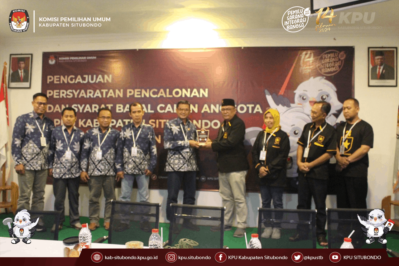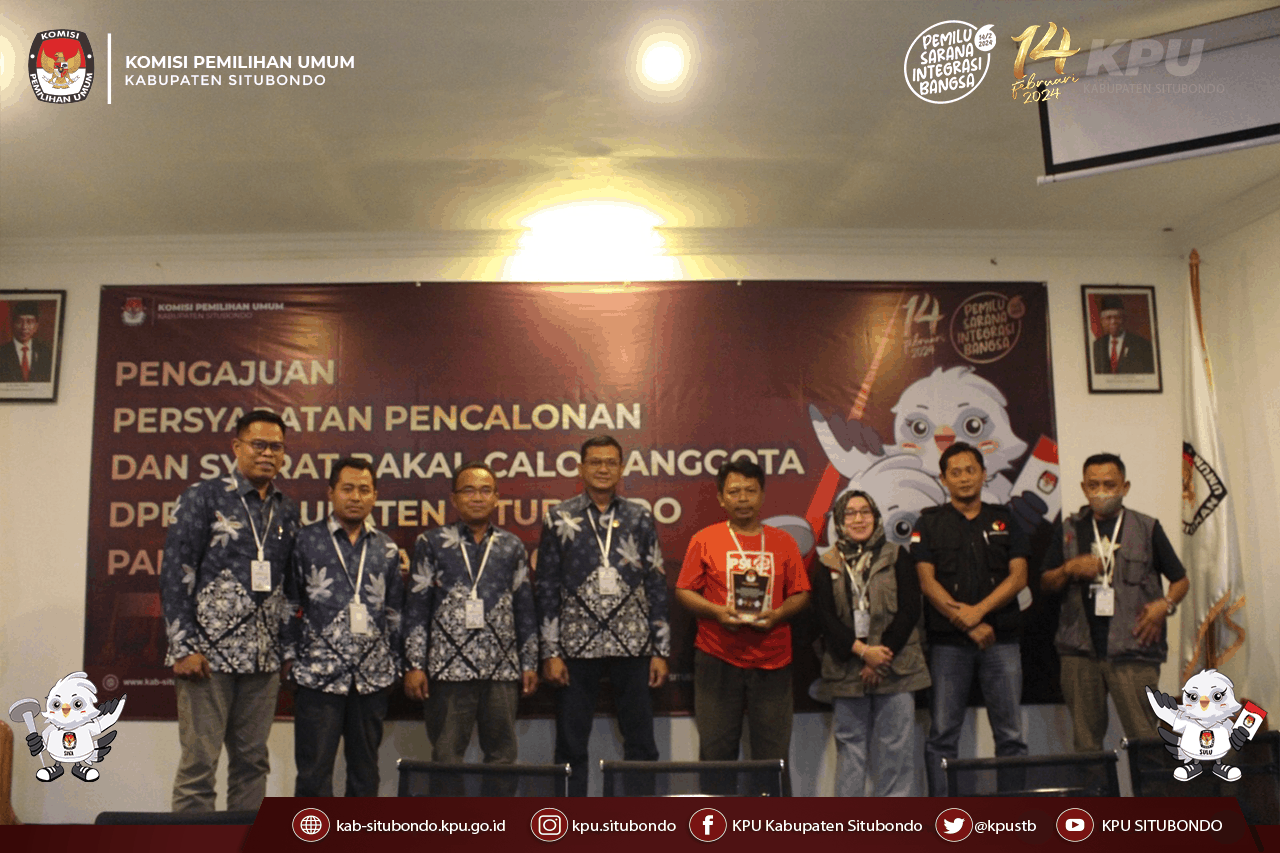 Situbondo, kab-situbondo.kpu.go.id - Partai Kebangkitan Nusantara (PKN) mengajukan bakal calon anggota DPRD Kabupaten Situbondo Pemilu 2024 ke KPU Kabupaten Situbondo, Minggu (14/5) pukul 21.08 WIB. Penyambutan berupa pengalungan selendang oleh Sekretaris KPU Situbondo, Sanayo bersama dengan Seluruh Kasubbag. Selanjutnya, Ketua DPC Partai Kebangkitan Nusantara (PKN) melakukan prosesi penyerahan dokumen persyaratan pengajuan Bacalon. Ketua KPU Situbondo Marwoto Menjelaskan pengajuan bakal calon DPRD Kabupaten Situbondo untuk Pemilu 2024, mulai tanggal 1 - 14 Mei 2023. “Adapun berkas dokumen kelengkapan administrasi, berupa formulir model B Pengajuan Parpol dalam bentuk fisik yang disampaikan langsung dan digital diunggah di Silon dan formulir Model B-Daftar.Bakal.Calon disertai foto diri terbaru bakal calon, dan dilampiri dengan dokumen persetujuan pengajuan bakal calon yang ditanda tangani oleh Ketua Umum Partai Politik Peserta Pemilu atau nama lain dan Sekretaris Jenderal Partai Politik Peserta Pemilu atau nama lain yang sah, sesuai dengan Keputusan Menteri yang menyelenggarakan urusan pemerintahan di bidang Hukum dan Hak Asasi Manusia tentang pengesahan susunan pengurus partai politik tingkat pusat dalam bentuk fisik disampaikan langsung dan digitalnya diunggah di Silon.” Terangnya. Adapun Ketua DPC Partai Kebangkitan Nusantara (PKN) Kabupaten Situbondo, Mohamad Rifa'i, menyampaikan bahwa Partai Kebangkitan Nusantara (PKN) Situbondo menyerahkan sebanyak 45 Bakal Calon Anggota DPRD Situbondo. (HK)