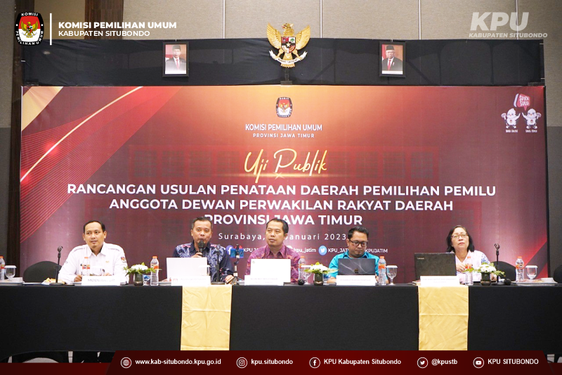 kab-situbondo.kpu.go.id – KPU Kabupaten Situbondo menghadiri undangan dari KPU Provinsi Jawa Timur tentang Uji Publik Rancangan Usulan Penataan Daerah Pemilihan dan Alokasi Kursi Anggota Dewan Perwakilan Rakyat Daerah Provinsi Jawa Timur Kamis, (19/1) di hotel Royal Tulip Darmo Surabaya, jalan Bintoro Nomor 21-25, DR. Soetomo Surabaya. Mengawali kegiatan tersebut, Ketua KPU Jatim Choirul Anam dalam sambutannya mengatakan kegiatan ini merupakan kegiatan istimewa, selain menghadirkan ke-18 Partai Politik peserta Pemilu 2024 juga dihadiri oleh 33 instansi tingkat Provinsi Jawa Timur. Anam, sapaan akrab Ketua KPU Jatim dalam sambutannya juga menambahkan pelaksanaan uji public kali ini akan membahas 3 rancangan usulan penataan Dapil dan alokasi kursi anggota DPRD Provinsi Jawa Timur. Lanjut, Anam juga menginformasikan kepada seluruh undangan bahwa KPU di 38 Kabupaten/Kota se Jawa Timur telah melaksanakan penataan Dapil dan alokasi kursi. Hasilnya telah disampaikan ke KPU pada 23 Desember 2022, karena keputusan final ada di KPU. Selain itu, dalam pelaksanaan kegiatan uji publik ini Ketua KPU Jatim berharap agar mendapatkan masukan dan tanggapan terhadap 3 rancangan usulan tersebut. “Kami memohon kepada seluruh undangan yang hadir disini untuk turut berpartisipasi aktif dalam uji public ini dengan memberikan tanggapan dan masukan terhadap 3 rancangan usulan penataan dapil yang telah kita lakukan” ujar Anam. Selain itu, Insan Qoriawan Divisi Teknis Penyelenggara KPU Provinsi Jawa Timur mengatakan bahwa tanggapan serta masukan masyarakat bisa disampaikan setelah kegiatan uji publik ini berlangsung melalui email tanggapan masyarakat yang disediakan oleh KPU Jatim. Semua tanggapan masyarakat akan direkap sebagai bentuk akuntabilitas atas rancangan yang akan diusulkan KPU Jatim ke KPU. Insan kemudian memaparkan ketiga rancangan usulan penataan Dapil DPRD Provinsi Jawa Timur Pemilu 2024 dihadapan publik. “Rancangan yang kami usulkan ke KPU adalah rancangan setelah mendapatkan tanggapan dan masukan masyarakat. Seandainya perlu diganti rancangannya, kami akan mempertimbangkan sebagai dasar mana yang akan kami usulkan ke KPU. Sebab kewenangan menetapkan tetap KPU,” tegas Insan. Usai pemaparan Insan, dilanjutkan dengan pemaparan dari para narsumber serta disambung dengan sesi diskusi bersama dengan peserta yang berasal dari parpol dan berbagai unsur masyarakat. Kegiatan tersebut digelar oleh KPU Provinsi Jawa Timur dengan mengundang 18 partai politik (parpol) peserta Pemilu 2024 tingkat provinsi, Divisi Teknis Penyelenggaraan dari 38 KPU Kabupaten/Kota se-Jawa Timur, serta 33 instansi/lembaga terkait. Diantaranya Badan Pengawas Pemilu, Kepolisian Daerah, Pangdam V Brawijaya, Kejaksaan Tinggi, Biro Pemerintahan dan Otoda, Dinas-dinas terkait, organisasi masyarakat, organisasi kepemudaan, perwakilan mahasiswa, pemantau Pemilu tingkat Provinsi Jawa Timur. Sedangkan narasumber yang dihadirkan yaitu Dosen FISIP Universitas Airlangga Surabaya, Dwi Windyastuti Budi H., Dosen FIA Universitas Brawijaya Malang, Muhammad Barqah Prantama, Dosen FISIP Universitas Negeri Surabaya, Agus Machfud Fauzi. (Qz)