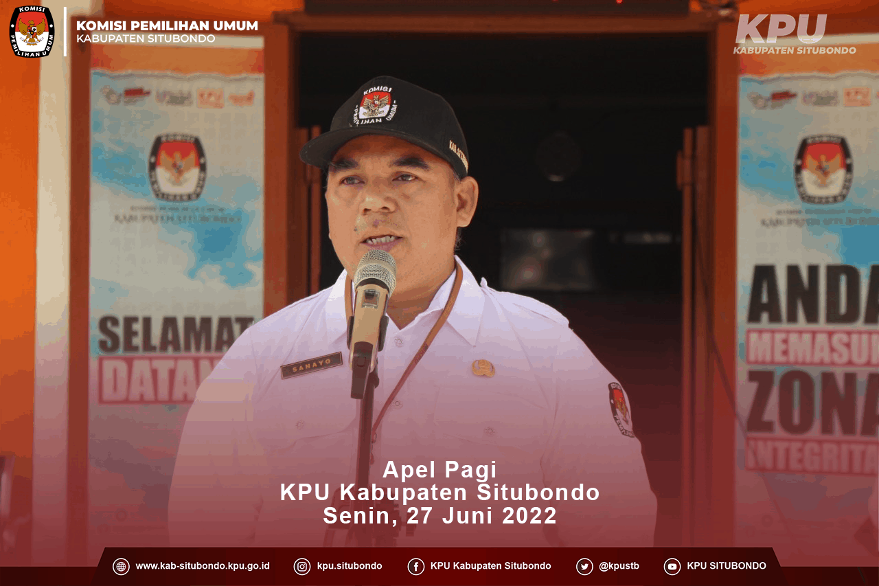 Situbondo, kab-situbondo.kpu.go.id – Senin (27/6), bertempat di halaman Kantor, tepat pada pukul 07.30 WIB, Jajaran Pegawai KPU Kabupaten Situbondo melaksanakan kegiatan Apel Pagi. Bertindak sebagai Pembina Apel kali ini adalah Sekretaris KPU Kabupaten Situbondo, Sanayo, dan Komandan Apel yaitu Kasubbag Hukum dan SDM, Deddy Rahmat Wahab. Dalam Apel kali ini, Pembina Apel memberikan beberapa arahan, diantaranya yaitu koreksi kepada jajaran petugas dan peserta apel, “dalam apel terdapat poin tentang menyanyikan lagu Indonesia Raya, disini kita harus menyanyikan secara bersama, jadi bukan hanya diam mendengarkan”, tuturnya. Selanjutnya Pak Sanayo juga mengatakan, “mulai bulan ini kita sudah memasuki masa tahapan Pemilu Serentak Tahun 2024, sehingga kita harus lebih bekerja secara ekstra demi kelancaran tahapan ini”, lanjutnya. Dalam penutupnya Pak Haji, sapaan akrabnya mengingatkan “untuk PPNPN terutama pramubakti agar tetap bekerja sampai jam 08.00 WIB, entah itu membersihkan ruangan, halaman maupun taman, dan untuk satpam agar tetap menjalankan SOP nya”, tutupnya. (HK)
